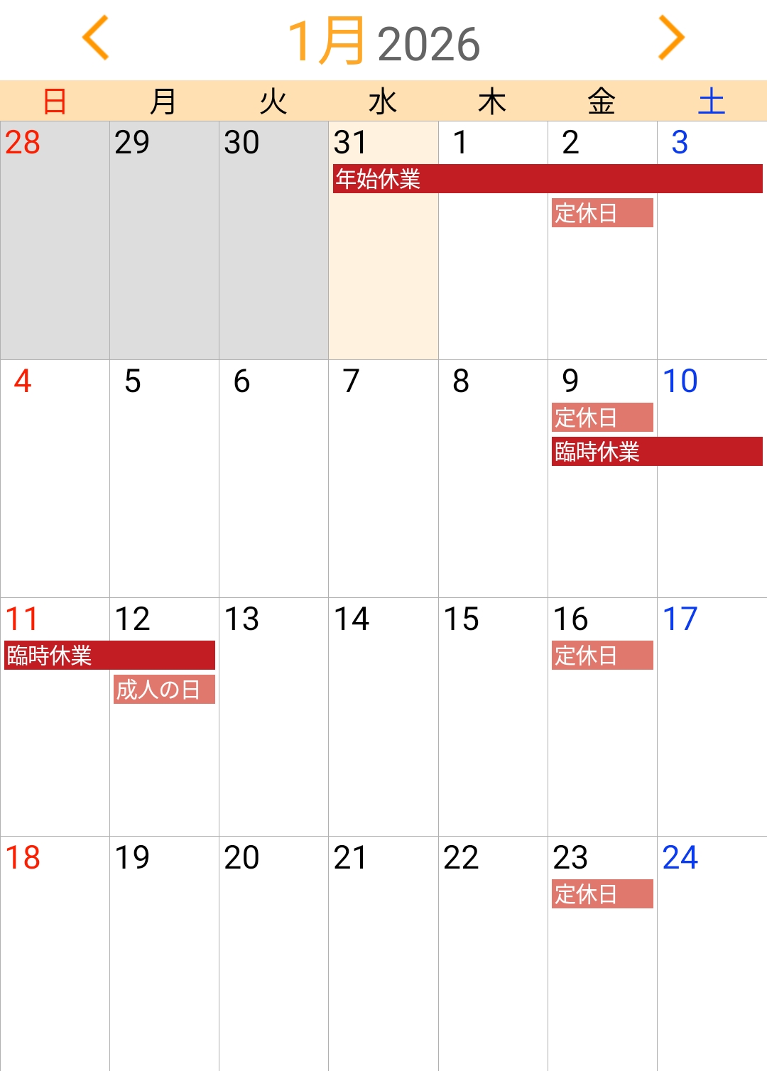 定休日のほか、年末年始の休業予定は上記の通りとなっております。