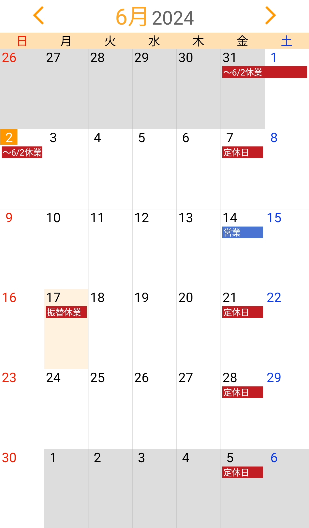 金曜定休日ですが6月14日(金)は営業6月17日(月)は振替休業いたします。また、暫定ですが7月19〜21日は臨時休業の予定です。こちらは変更する可能性もございますが、また追ってお知らせいたしますのでよろしくお願いいたします。