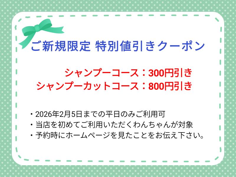 一部の犬種はシャンプーカットコース後、5週以内でのみ値引きとなります。